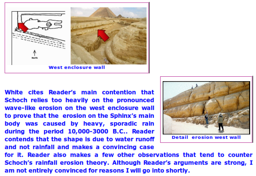 First let me say there is a very persuasive, but by no means final, summing up by Chris White of the argument between geologists Robert Schoch and Colin Reader on the cause of the erosion we see on the body of the Sphinx.